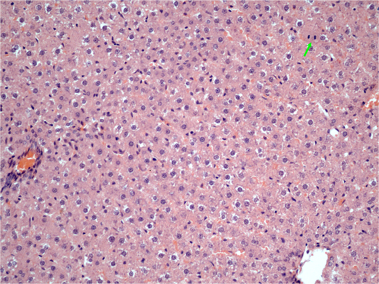 Результаты. Достоверного различия в массе прироста остатка печени и в биохимических показателях крови на сроке 48 часов после ОРП в обеих группах не обнаружено. Оценка митотического индекса гепатоцитов через 48 часов после ОРП выявила достоверное его увеличение в обеих группах по сравнению с исходным значением (до резекции печени), равным 0,14 ± 0,07‰. В первой группе животных величина МИ составила 12,70 ± 4,9‰, во второй группе – 17,43 ± 4,90‰, (p ≤ 0,05).